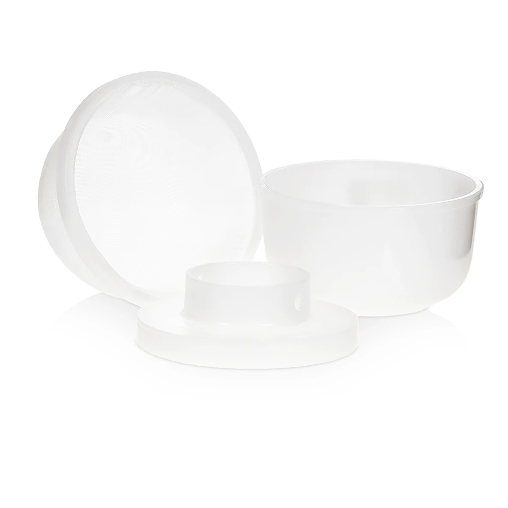 KADOVA® sūrio formas sudaro 4 dalys: forma, formos grotelės, dangtis, dangčio grotelės. Speciali tinklelio konstrukcija užtikrina išrūgų nutekėjimą, formos ir plutos formavimąsi.