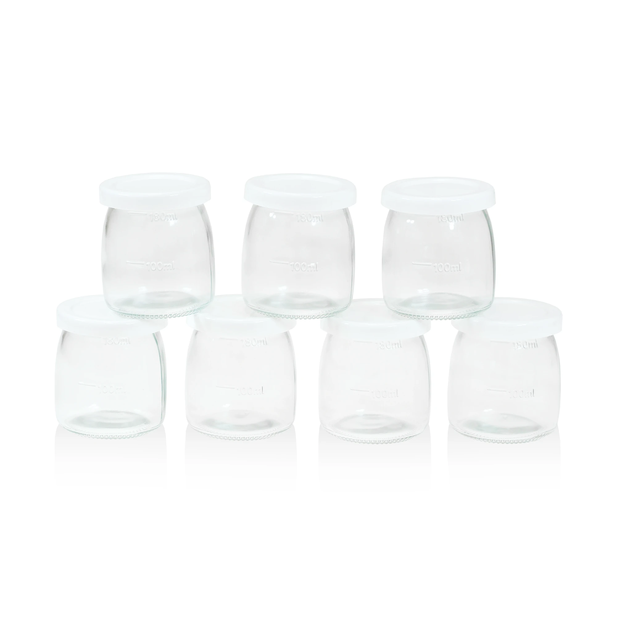 Stikliniai indeliai – 7 stikliniai daugkartinio naudojimo stiklainėliai su dangteliais, kuriuose produktas gaminamas ir laikomas šaldytuve.