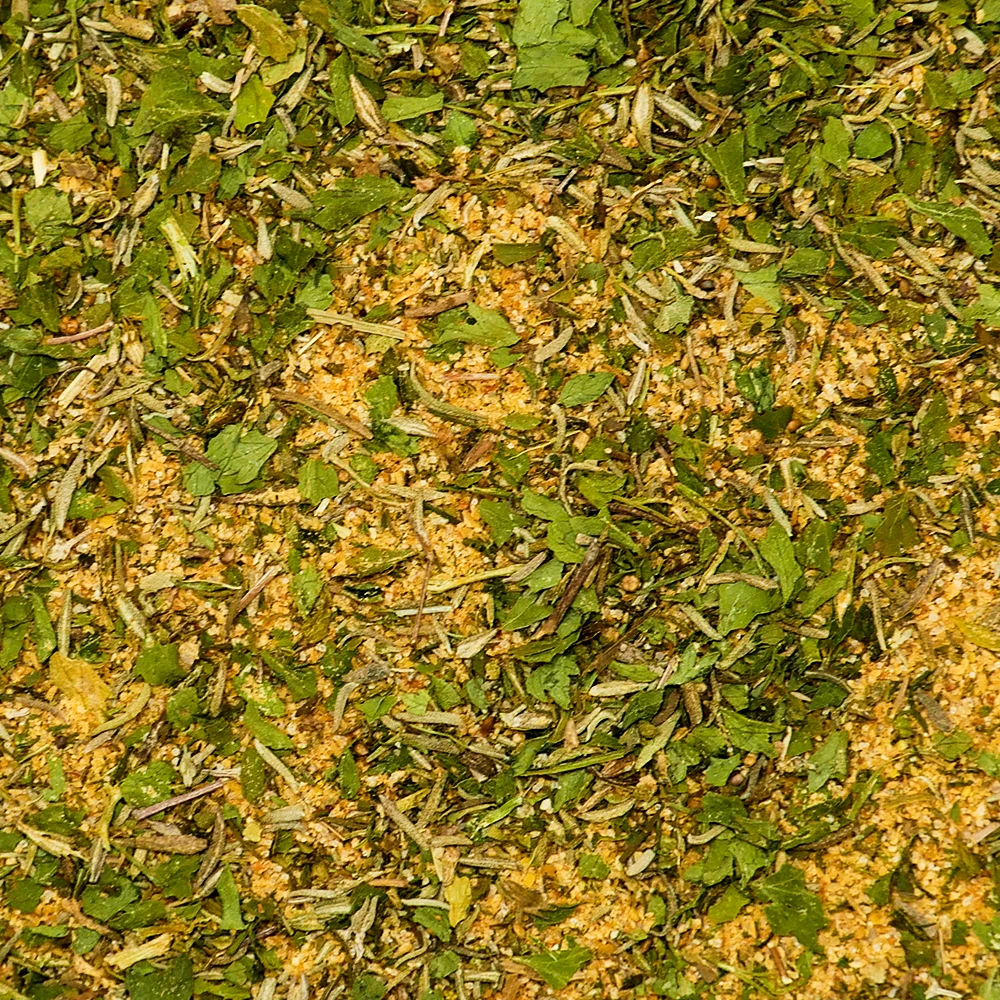 Sudėtis: granuliuotas česnakas, druska, malti garstyčių grūdai, čiobreliai, krapai, petražolių lapai, čiobreliai.