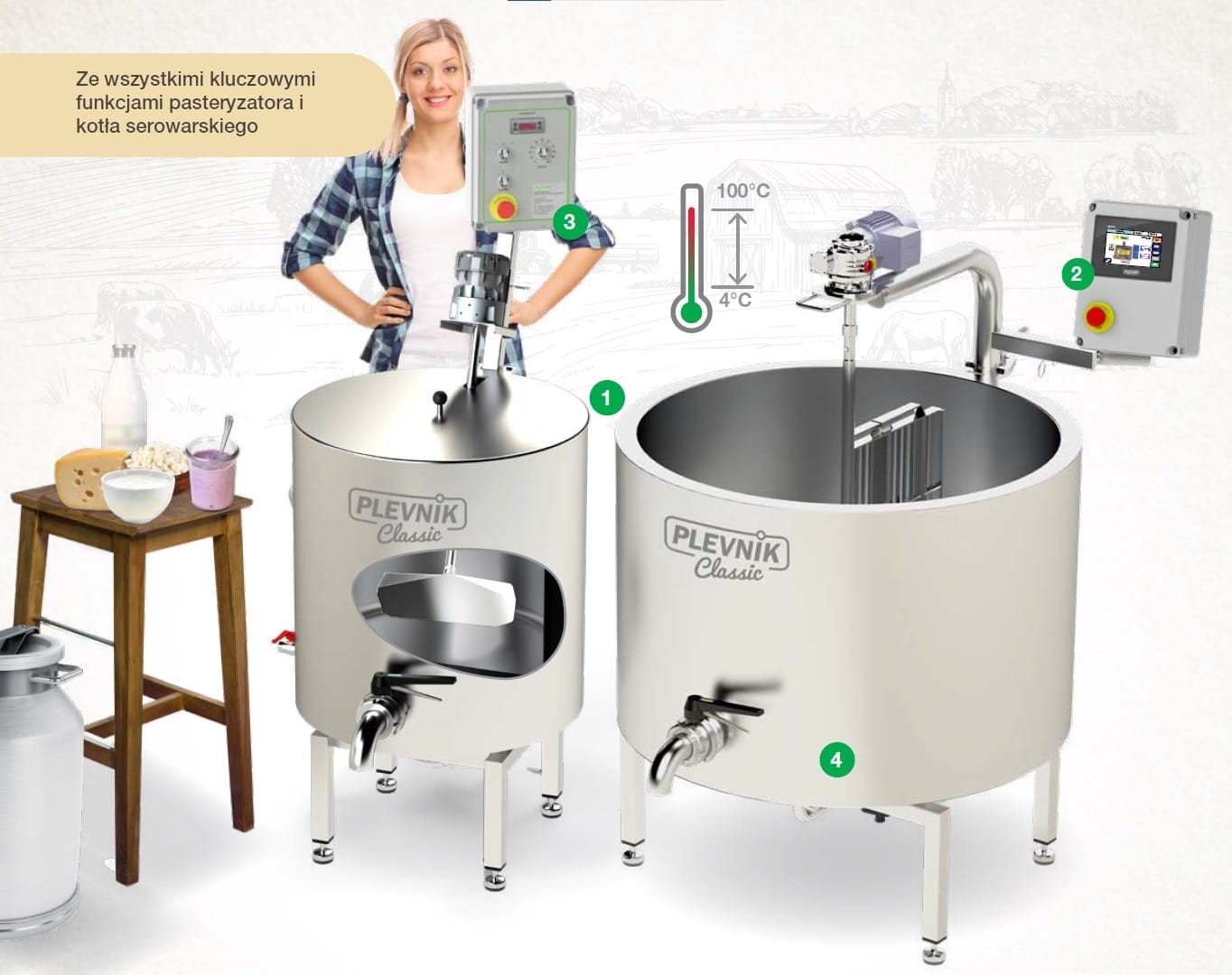 Katilas ir pasterizatorius Classic skirtas pieno terminio apdorojimo procesams gaminant pieno produktus, tokius kaip pasterizuotas pienas, minkštas sūris, kietas sūris, pusiau kietas sūris, jogurtas, kefyras, varškė ir kt.