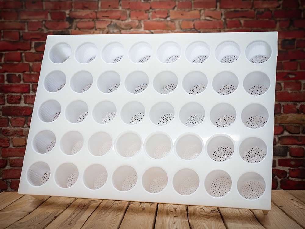 Aukštos kokybės multiforma, 70 x 50 cm dydžio, su kojelėmis. Joje yra 40 apvalių angų (5 x 8 eilių) su integruotomis Formaggio formomis 7,5 x 9,3 cm (0,2 kg kiekviena).