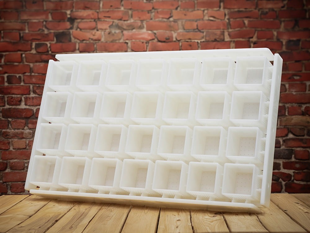 Aukštos kokybės multiforma, 72 x 43 cm dydžio, su kojelėmis. Turi 28 stačiakampes angas (4 x 7 eilučių) su integruotomis formomis, kurių matmenys 7,5 x 7,5 cm, aukštis 9 cm (po 0,5 kg kiekviena).