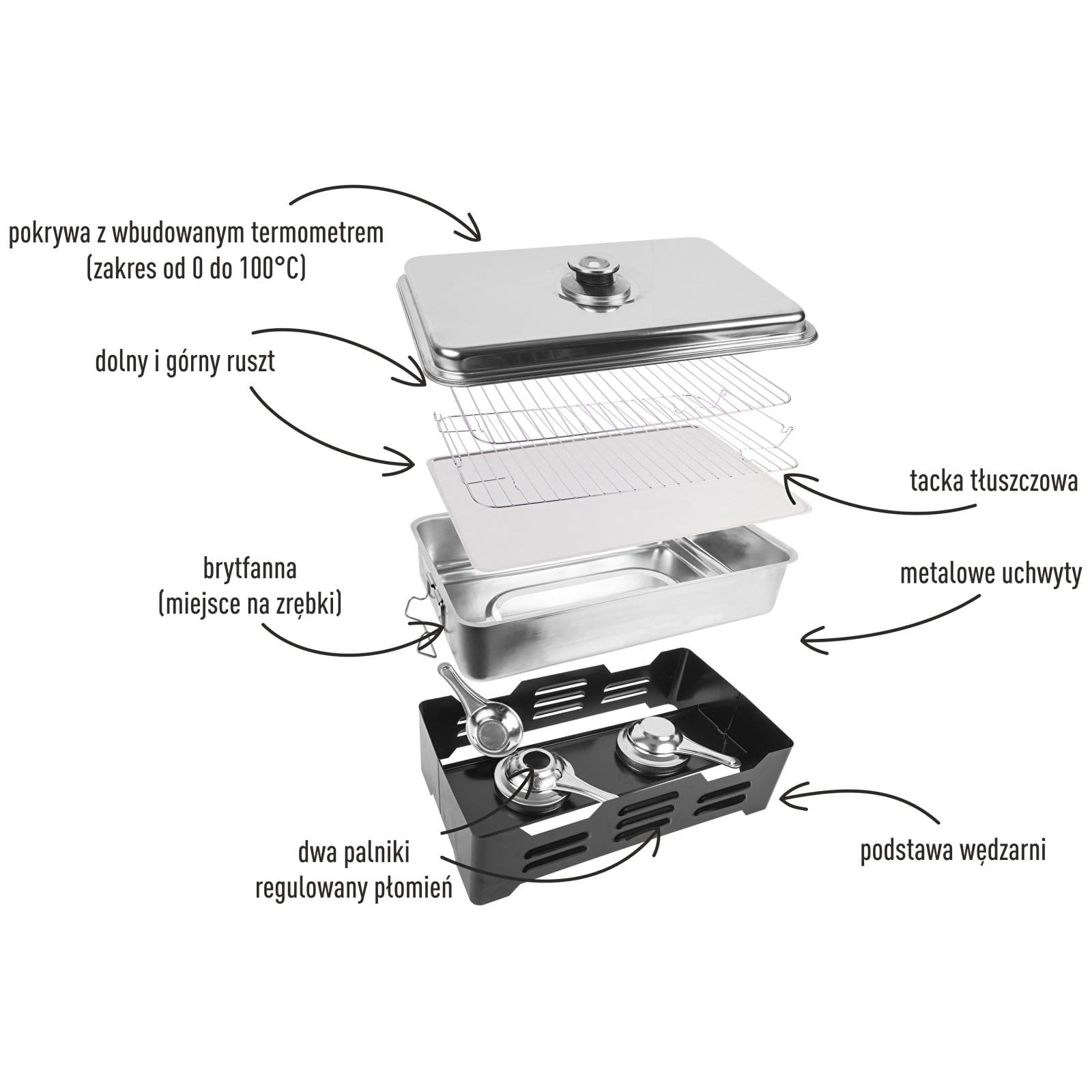 Dwa palniki zasilane paliwem żelowym pozwalają na wędzenie bez dostępu do gazu czy prądu. Wędzenie polega na podgrzewaniu od spodu zrębków wędzarniczych umieszczanych na dnie wędzarni, w efekcie czego wytwarza się dym wędzarniczy. Nadmiar tłuszczu powstającego podczas wędzenia ocieka na specjalną tackę tłuszczową, dzięki czemu nie spala się on, a cała wędzarnia niemal nie generuje dymu. Jednocześnie tacka gwarantuje brak kontaktu paliwa z wędzoną żywnością. Specjalne palniki posiadają regulację płomienia, co pozwala zwiększać lub zmniejszać temperaturę w komorze wędzarniczej. Termometr dołączony do wędzarni pozwala zaś na kontrolę tej temperatury i utrzymanie jej na optymalnym poziomie. Twoje ulubione dania będą aromatyczne i pyszne!